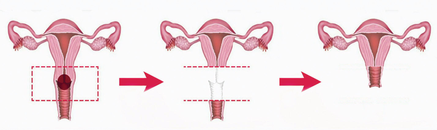 - Laparoscopic uterine cervix, uterine cavity, pelvic lymph node, and lymph nodes around the aorta are resected and the uterus is preserved to maintain fertility